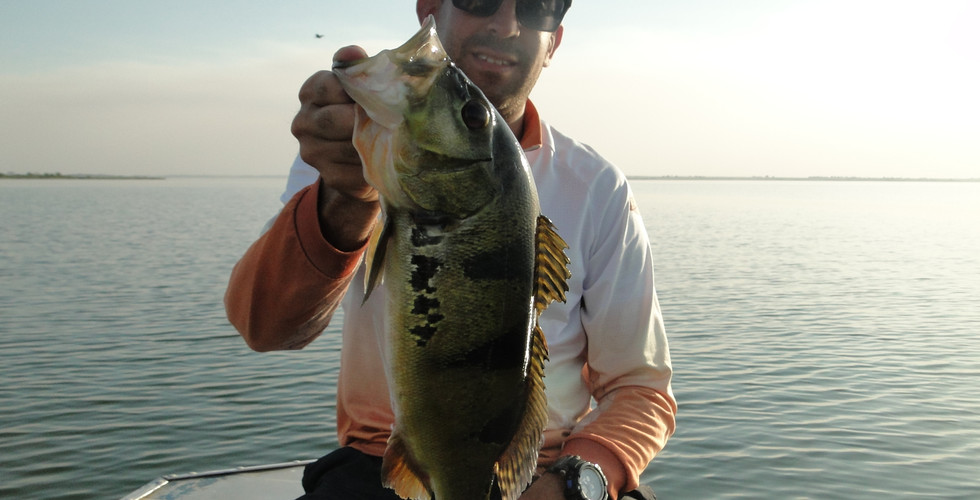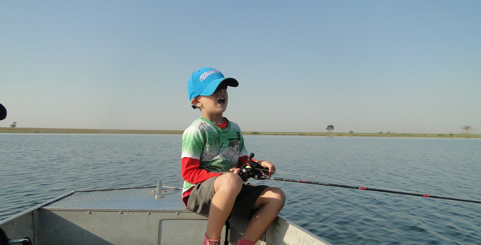 Paramos para nos hidratar, comer uma lanche, passar protetor e voltar pescar, então voltamos para um outro ponto, pois aonde estávamos já tínhamos pego 4 tucunarés. Ao chegar no ponto, foi só alegria, chegamos com boas pancadas, ate engatar outro amarelo.