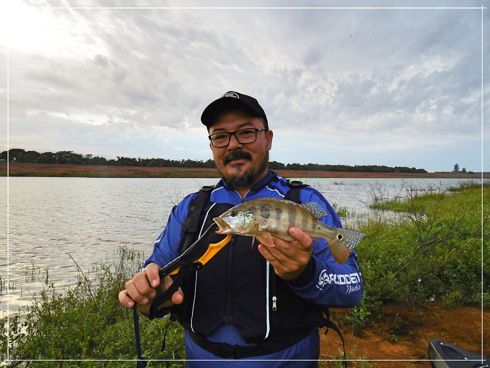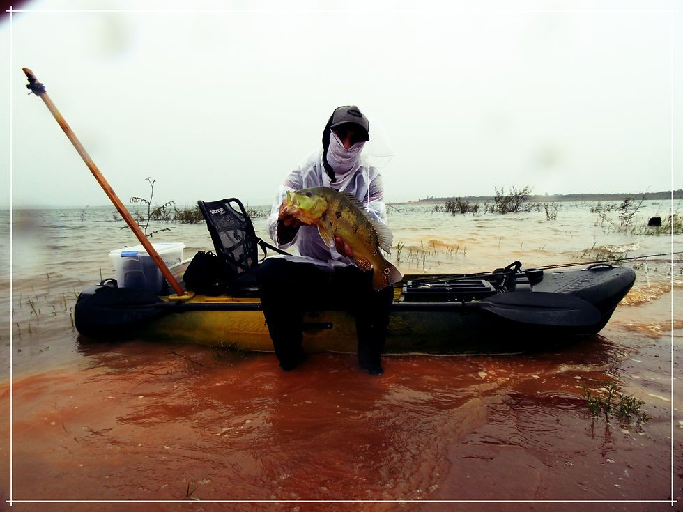 Dormimos debaixo de chuva e não foi pouca, nosso pensamento era de não desistir, por isso dormimos tranquilos. Acordamos novamente as 5 horas e partimos para água, indo para outro ponto da represa, nossa escolha foi certa até as 9 horas, depois disso o vento tomou conta da represa, nos cansando muito para remar e posicionar o caiaque, mas mesmo assim, consegui fisgar 3 tucunarés e o Mario também, tiramos foto rapidamente, pois o vento e a chuva estavam cada vez mais fortes.